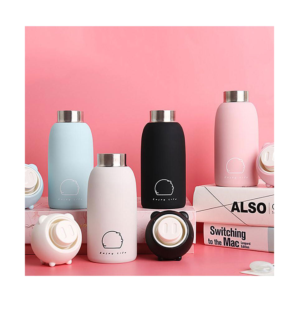 Made of stainless steel and food grade PP silicone materials, more durable and resistant than plastic, glass bottle. The lovely Pig shape cartoon design, white dots on the bottle, vigorous candy colors, a perfect gift for boys, girls or ladies.Thickened cup bottom, special design, more durable and long lasting in use. Well matte coated paint, smooth and shiny feel. Comfortable to hold in hands and convenient to put in the bag with its compact size, suitable for home use. Stainless steel interior, easy to clean and leaves no unwanted odor to your drink; Screw-on silicone cap, convenient to open and leak-proof, it has a watertight seal for the water bottle, works perfect for traveling, shopping, walking, school or office.